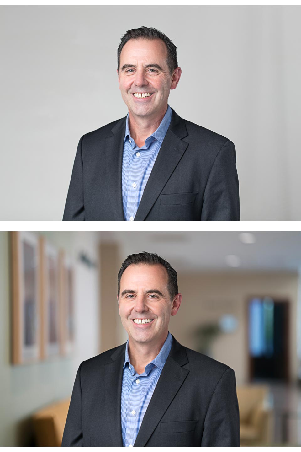 Here is an example of our client’s headshot that was made at our studio with a retouched office background in post production. The first images is of our studio wall and the one below is a background image provided by the client.